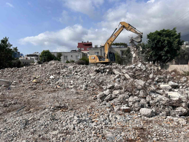 Hatay’ın Arsuz ilçesinde iş makinasıyla yıkılan 5 katlı binanın yerle bir olma anı cep telefonu kamerasına yansıdı.
