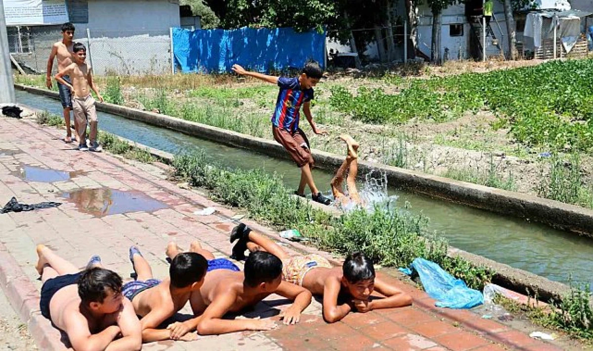 Türkiye'nin en sıcak illerinden Adana'da sulama kanallarında boğulma tehlikesinden korkan bazı çocukların kanaletlerde yüzüp, kaldırımda uzanıp güneşlenmeleri dikkat çekti.