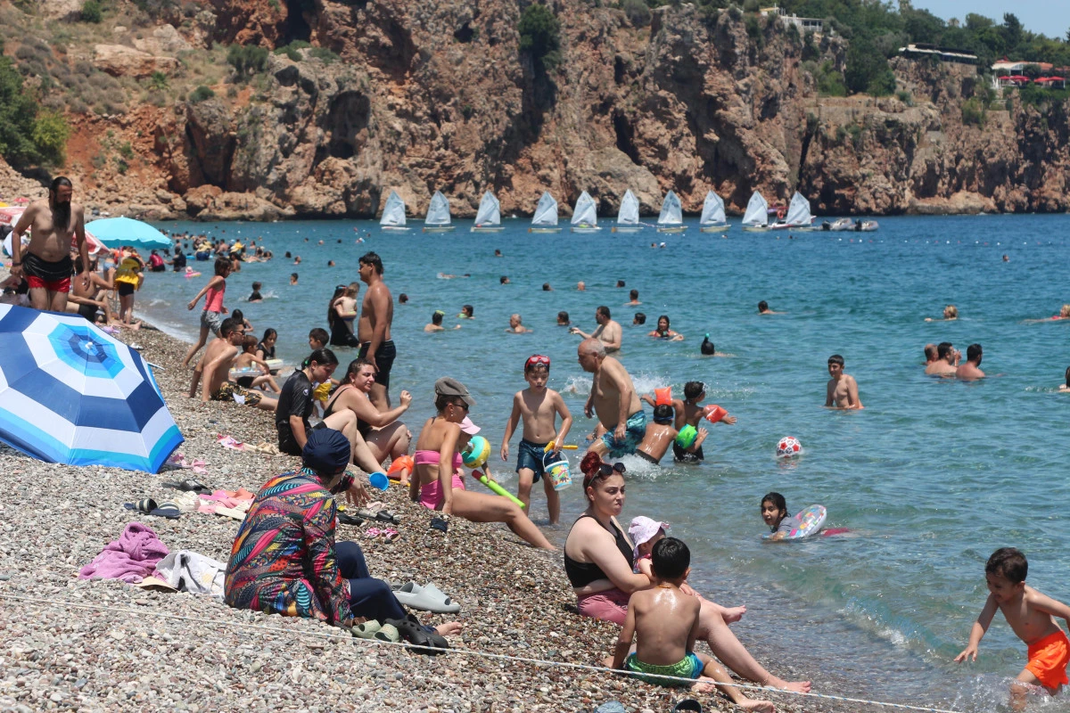 Bunaltıcı sıcaklara rağmen Antalya’nın dünyaca ünlü Konyaaltı Sahili boş kalmadı. Yerli ve yabancı tatilciler sabah saatlerinden itibaren sahile akın etti. Kimi şemsiyelerin altında gölgelenmeyi tercih ederken, kimileri ise Akdeniz’in serin sularında yüzerek ferahlamaya çalıştı.