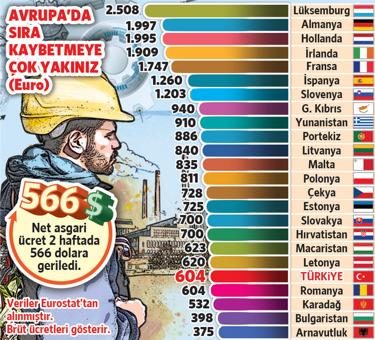 Brütte 20 bin 2 TL olan asgari ücret Avrupa ülkeleri arasında en düşük beşinci ücret oldu. Türkiye’den sonra asgari ücrette alt sıralarda, 44 cent farkla 604 Euro ile Romanya, 532 Euro ile Karadağ ve 398 Euro ile Bulgaristan ve 375 Euro ile Arnavutluk bulunuyor. TL’deki değer kaybı, asgari ücrete ikinci zammın yapılmayacağının açıklanması ve Merkez Bankası’nın mayısta enflasyonun yüzde 70-75’leri göreceğine dair öngörüsü de asgari ücretteki erimenin artacağını gösteriyor.