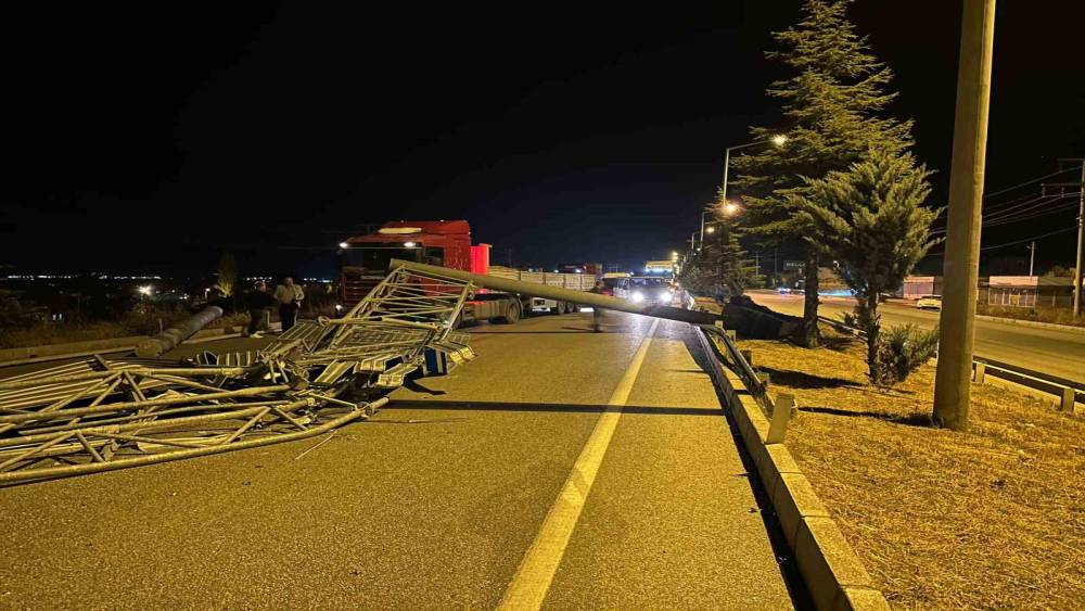 Burdur’da dorsesi açık kalan kamyonun çarpması sonucu devrilen trafik levhası nedeniyle yol uzun süre trafiğe kapandı.