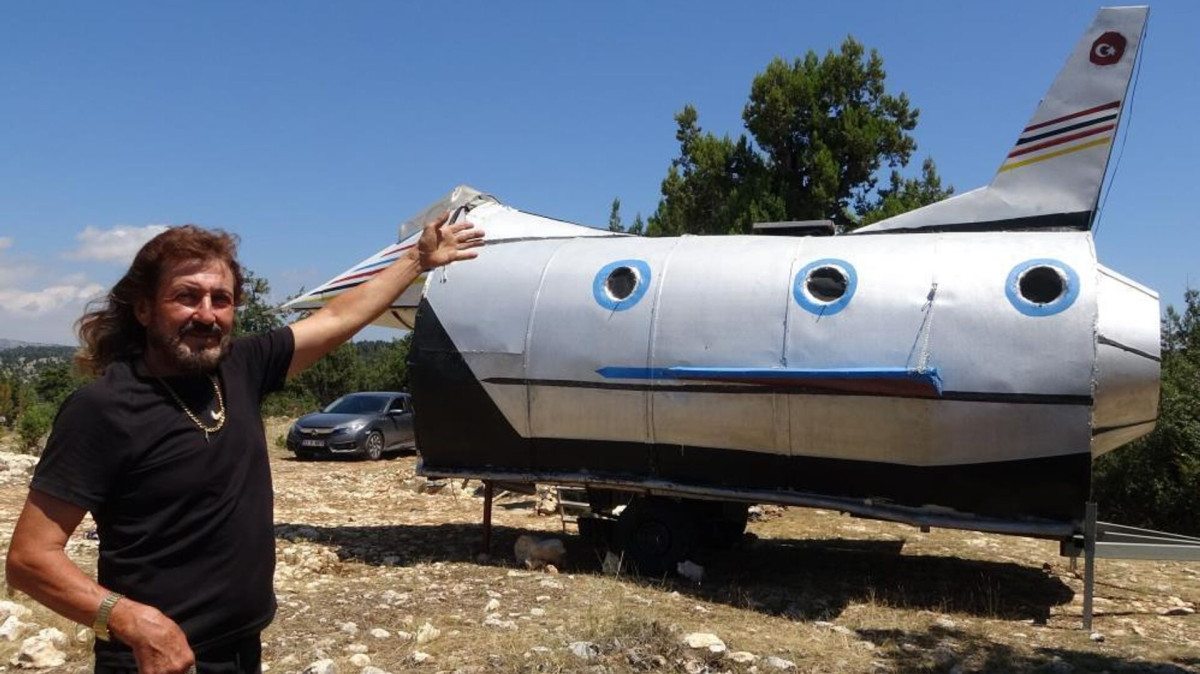 Mersin'in Erdemli ilçesinde bir kişi savaş uçağı F-16'dan esinlenerek yaylada kullanmak için uçak ev yaptı, kendisine 500 bin TL teklif ettiler satmadı.