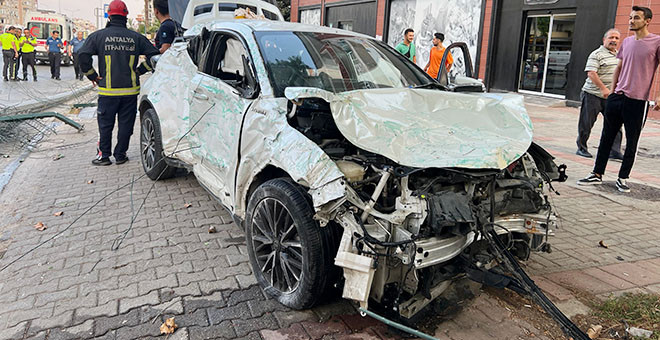 Antalya’nın Alanya ilçesinde aşırı hız yapan sürücünün kontrolünden çıkan otomobil, önce ticari taksiye ardından refüjdeki aydınlatma direğine çarptıktan sonra karşı şeride savruldu. Alkollü olduğu iddia edilen sürücü, olay yerine gelen polis ve sağlık ekipleriyle tartıştı. Kaza, saat 08.00 sıralarında Kadıpaşa Mahallesi Keykubat Bulvarı üzerinde meydana geldi. Gazipaşa istikametine seyir halinde olan ve aşırı hız yaptığı iddia edilen B.T.B.’nin kullandığı otomobil, alt geçitten çıktığı sırada direksiyon hakimiyetinin kaybedilmesiyle aynı yönde ilerleyen ticari taksiye çarparak kontrolden çıktı. Otomobil refüjdeki aydınlatma direğine çarptıktan sonra karşı şeride savruldu. Devrilen aydınlatma direğiyle beraber metrelerce sürüklendikten sonra kaldırıma çıkarak duran araçta sürücü B.T.B. ve yanındaki S.A. yaralandı. Kaza sonrası gergin anlar yaşattı. Kazayı hafif sıyrıklarla atlatarak araçtan çıkan ve alkollü olduğu öne sürülen sürücü B.T.B. gergin anlar yaşattı. Daha sonra B.T.B., ihbar üzerine olay yerine gelen polis ve sağlık ekipleriyle tartıştı. Bunun üzerine polis ekipleri güçlükle sakinleştirdiği sürücü B.T.B.’yi gözaltına aldı. Diğer yaralı S.A. ise sağlık ekipleri tarafından ambulansla hastaneye götürüldü. S.A.'nın hayati tehlikesinin bulunmadığı öğrenildi. Kaza anı ise güvenlik kamerasına yansıdı.