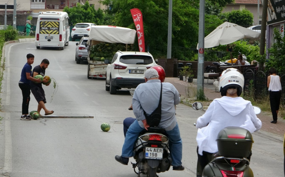 Güvenlik kamerasına da yansıyan görüntülerde küçük çocuğun düştüğü anda elinde ekmek bıçağı bulunduğu, şans eseri kazayı yara almadan atlatması ve düştüğü yerden kalkarak elinde bıçakla kamyonetin arkasından koşması dikkat çekti. Aynı görüntülerde kamyonet kasasında bulunan çocuğun düştüğünü fark eden araç sürücüsünün rampada aniden durması ile birlikte çok sayıda karpuzun kamyonetten düşerek yola saçıldığı görüldü.Olayı fark edip duran kamyonet sürücüsü ve yanındaki başka bir çocuk yola dökülen karpuzları topladı.