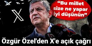 CHP Genel Başkanı Özgür Özel, erişim engelleri nedeniyle X'e açık çağrı yaptı: "Bu millet cuntacıların medya düzenini yıktı geçti… Erişim engeli taleplerini uygularsanız size ne yapar iyi düşünün!" Özel'in X'teki açıklaması şöyle:Bir darbe girişiminin en önemli ayağı halkın haber alma özgürlüğünü kısıtlamaktır. 19 Mart cuntacıları da RTÜK'ün muhalif kanallara yönelik baskılarıyla yetinmiyorlar.