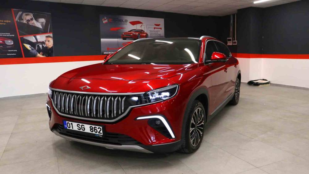 Türkiye’nin ilk yerli ve milli otomobili Togg’u Adana’da satın alan bir kişi, aracını kentin sıcağından korumak için camlarına film kaplatıp, rengi de güneşten solmasın diye boya koruma filmi yaptırdı.