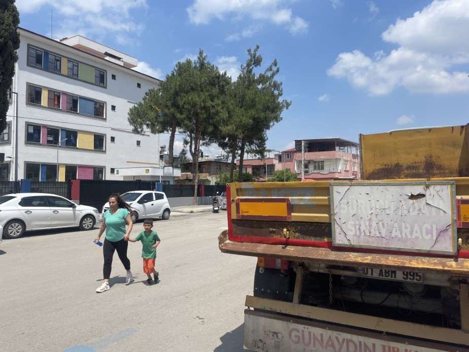 Adana'da ilkokul önünde verilen tır sürücülüğü eğitimine veli ve öğrenciler tepki gösterdi.