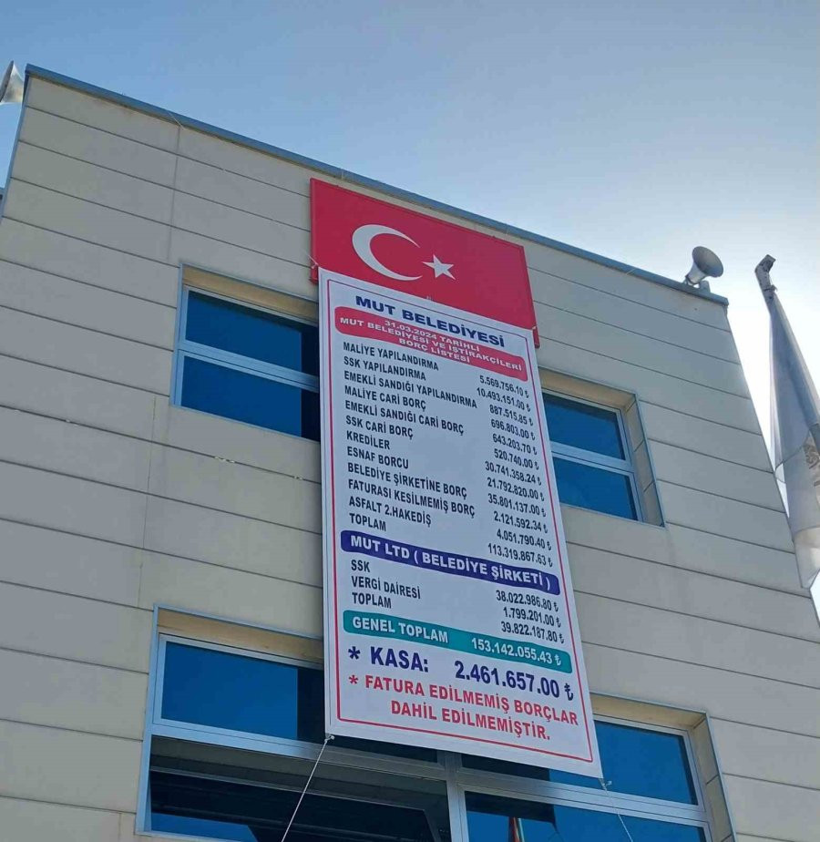 Mersin Mut Belediye Başkanı Murat Orhan, devraldığı belediyenin borcunu, belediye binasına astırdığı afişle duyurdu. Mut Belediyesinin 153 milyon 142 bin 055 lira 43 kuruş borcu olduğu açıklandı.