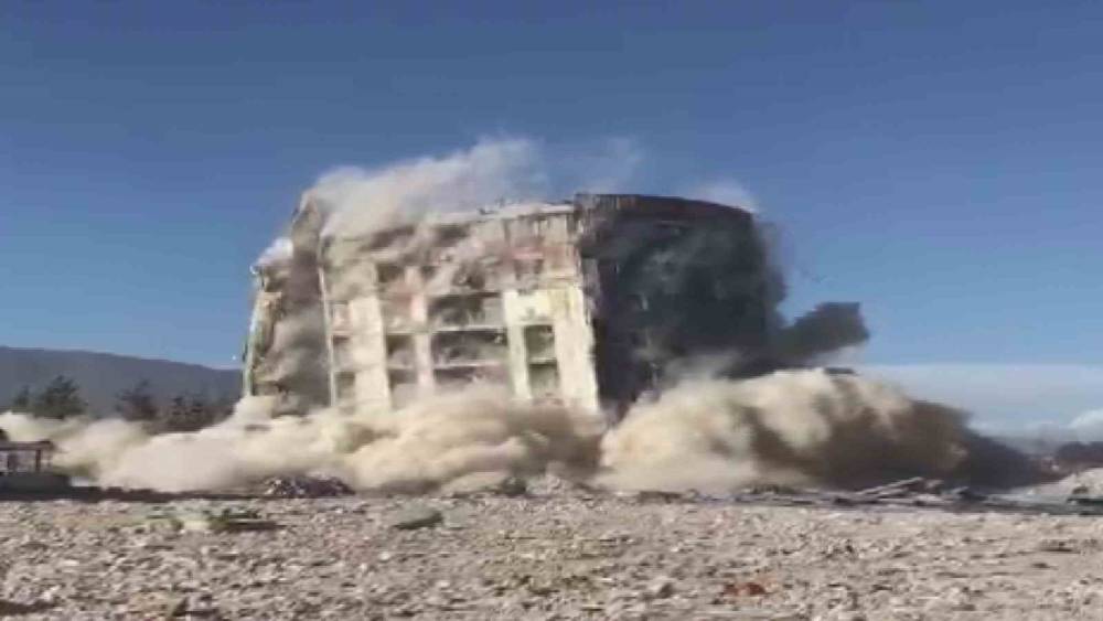Depremin vurduğu Hatay’da yıkım esnasında iş makinesinin üzerine devrilen hastanenin 9 katlı ana bloğu dinamitle patlatılarak yıkıldı.